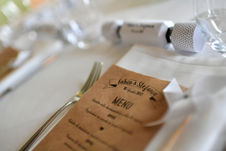 Sulla tavola: menu sacchetto porta grissini, girandola segnaposto & crakers benaugurali.