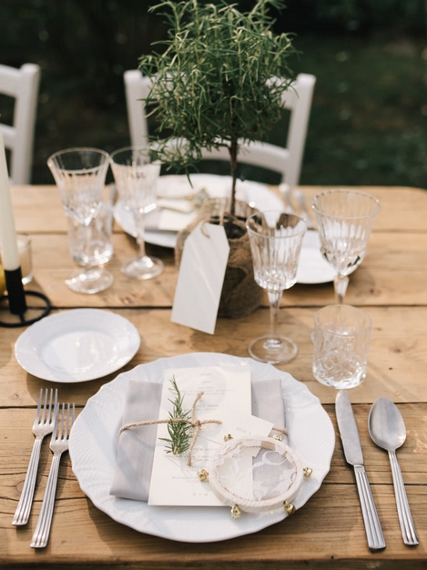 Sulla tavola: tag segnatavolo, menu e segnaposto.